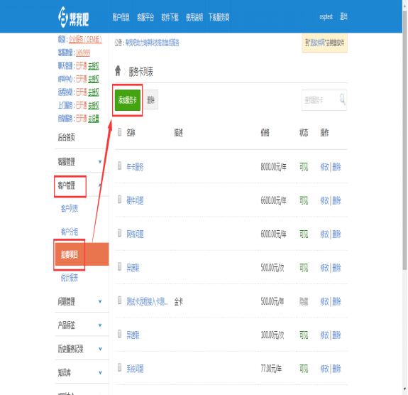 1.管理軟件廠商可登陸幫我吧后臺(tái),點(diǎn)擊項(xiàng)目管理->扣費(fèi)項(xiàng)目->添加服務(wù)卡->添加一個(gè)新的服務(wù)收費(fèi)項(xiàng)目。